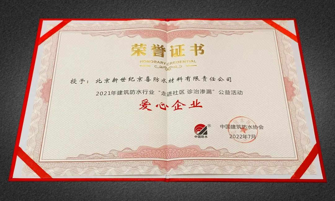 京喜防水榮獲2021年建築防水行業“走進社區 診治滲漏”愛心企業榮譽稱号。