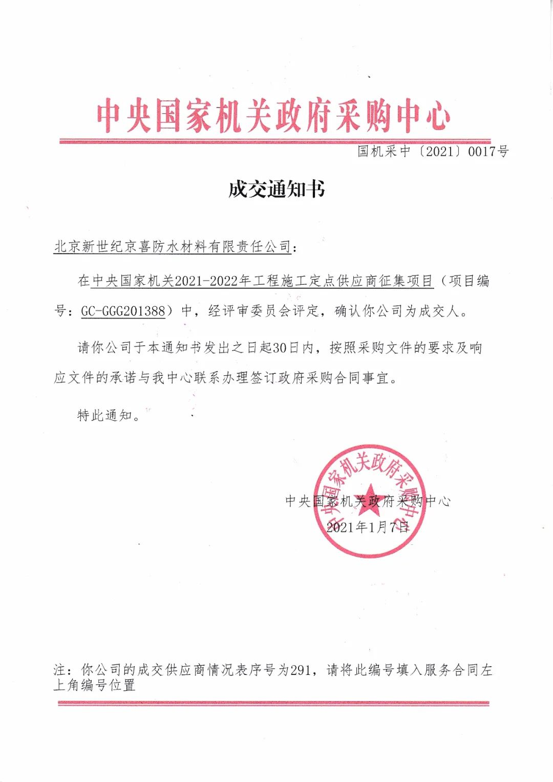 近日,京喜防水再次成為(wèi)中央國家機關(guān)政府采購(gòu)2021-2022年工程施工定點供應商(shāng)。中央國家機關(guān)政府采購(gòu)對供應商(shāng)企業有着很高的要求,同時(shí)也(yě)是各地方政府采購(gòu)招标工程施工企業的重要依據。經過專家組的多次評審,京喜防水以資質實力、優質産品、技術團隊、工程質量、售後服務(wù)、品質口碑等各方面的突出優勢,再次喜獲殊榮。